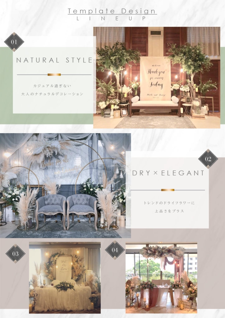 どのテンプレートも細部までこだわったデザインなので、打ち合わせ無しでもステキな高砂が仕上がります